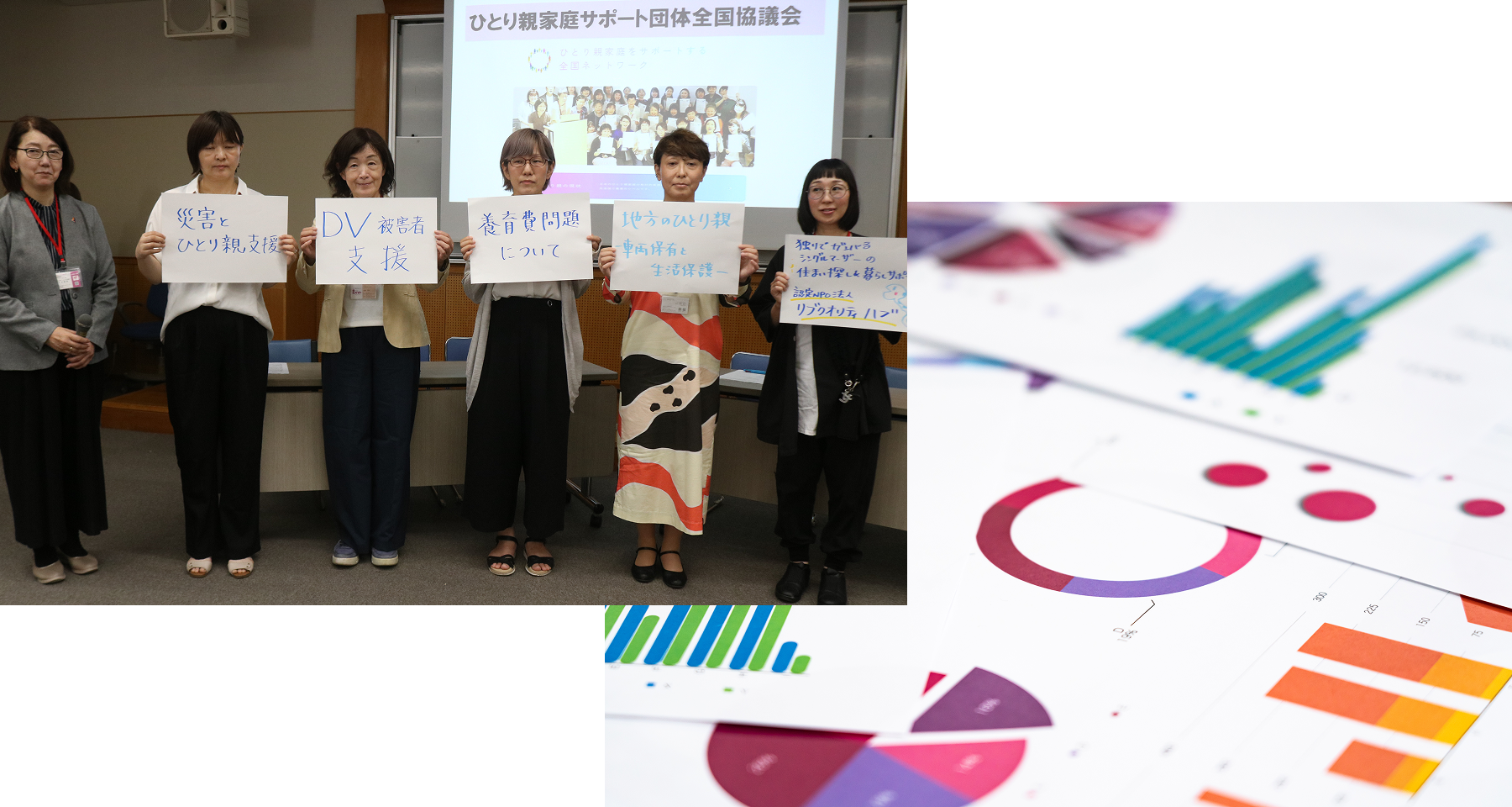 ひとり親家庭の状況はまだまだ知られていません。ひとり親とこどもたちの状況や支援に関するさまざまな課題の調査を行います。また改善のための提言をまとめて国や都道府県・自治体に届けます。またその提言をもとに政策実現をめざします。