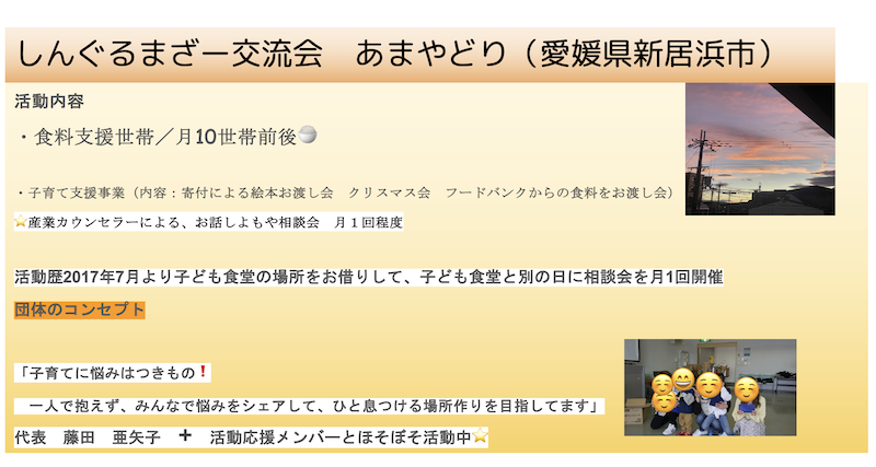メンバー member あまやどり(新居浜・愛媛) 隔月に1回、シングルマザーの座談会を開催。新居浜中村松木こども食堂と連携して、食料支援や、衣類の支援など開催。 データ 〒792-0022 愛媛県新居浜市徳常町5-44 藤田方 080-5661-8847 - メンバー一覧に戻る